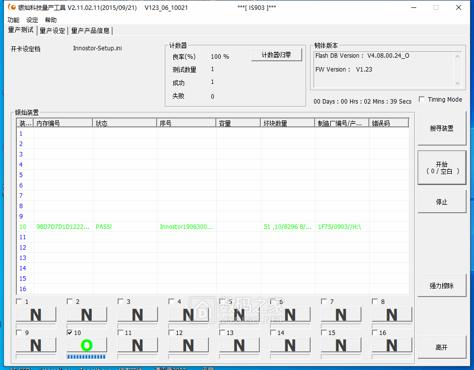 此主控不但支持此闪存做U盘,而且还是支持得最好的,做出的U盘速度快,寿命长,质量好,下面就是用此主控和闪存制作的一个U盘,首次开卡使用的量产工具是is903 v2.11.02.11版