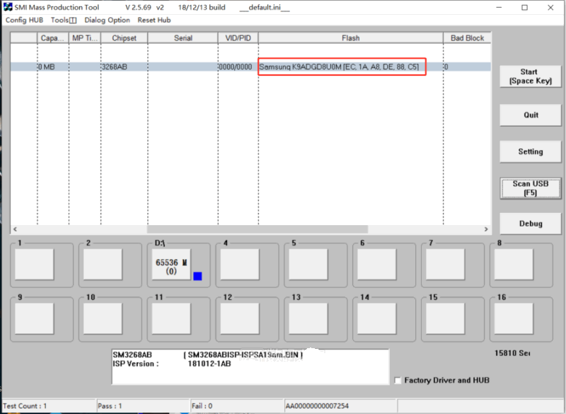 闪存吹上后,直接用 慧荣SM3268AB V2.5.69版量产工具识别如下图
