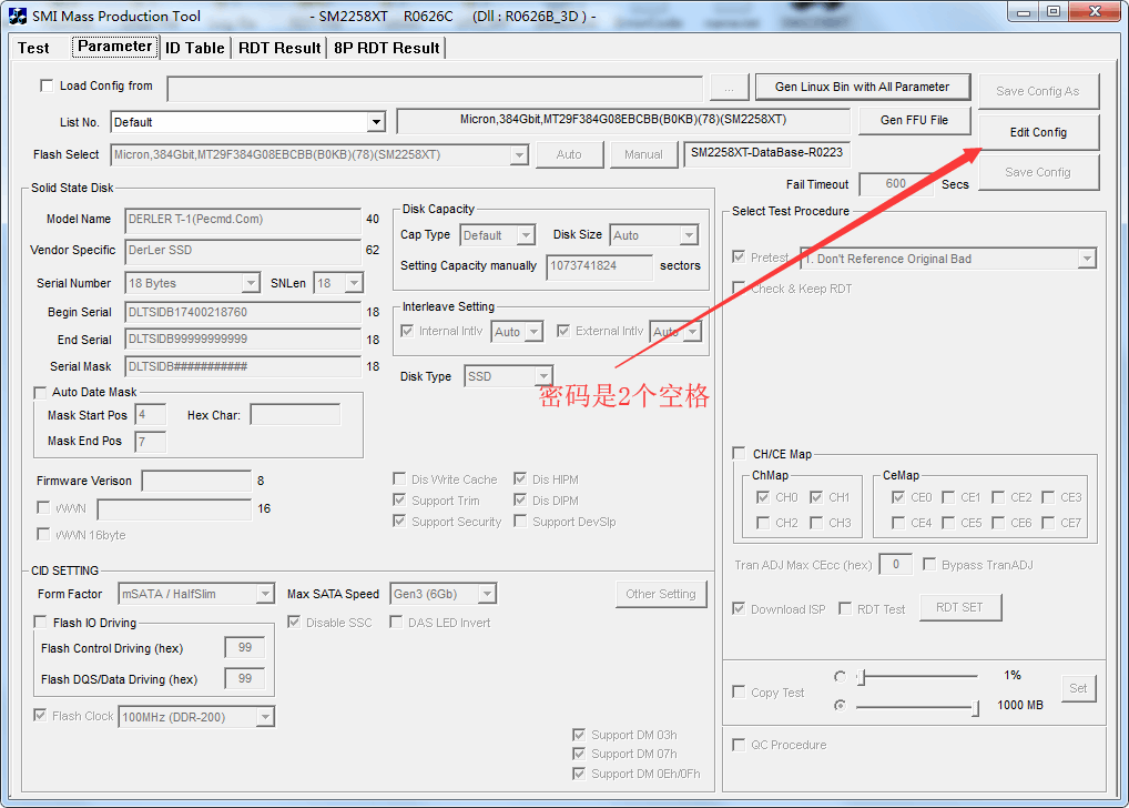 2、打开开卡工具,如下图,我们点击parameter项,点edit config,输入两个空格密码。