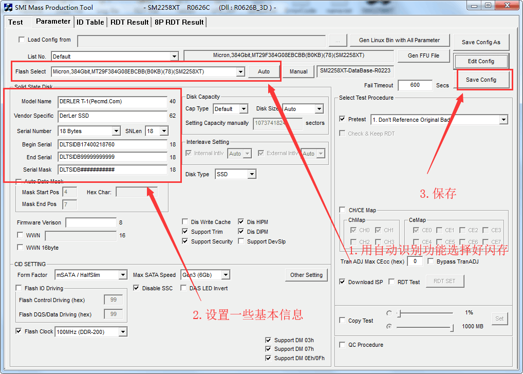 3、直接点下图的auto自动识别闪存,然后设置一些固态硬盘的基本信息,如下图,这个可以按你自己的固态硬盘设置,设置完后点save保存。