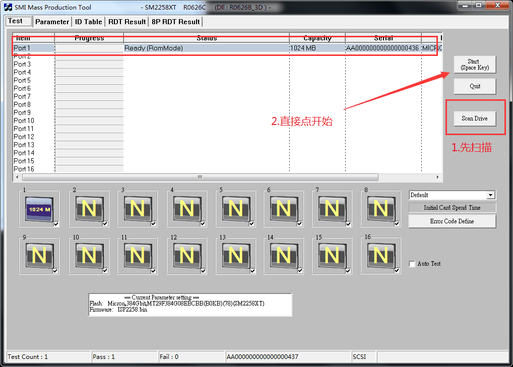 4、然后点scan可以发现你的固态硬盘,发现后,直接点start开始量产。