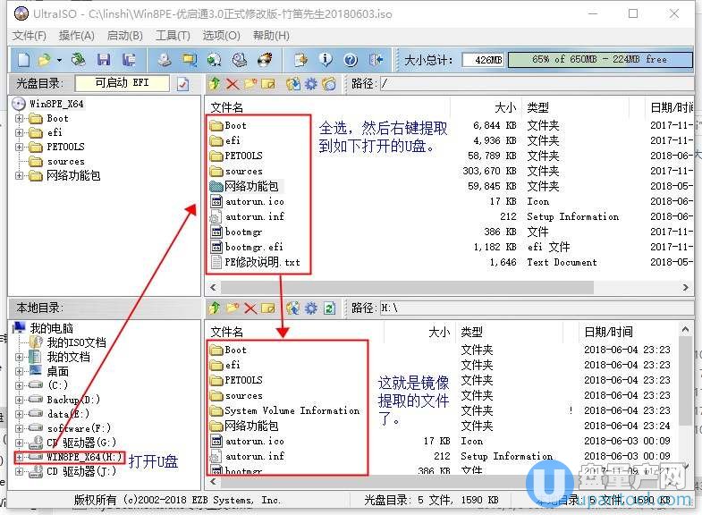 2、然后再用UltraISO打开本ISO镜像如下图这样操作