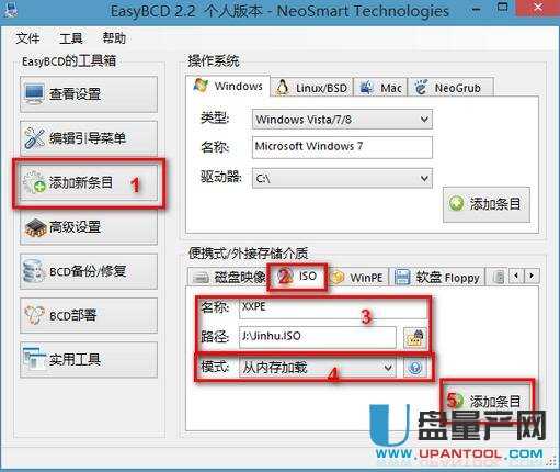 打开U盘内的BCD文件后,依次点击“添加新条目-便携式/外接存储介质ISO-填写名称和选择U盘目录下的iso-从内存加载-添加条目”即可,要加多少加多少,随时可以修改。目前测试过增加PE和windows、linux条目均正常启动,但系统类ISO加载太久,不推荐,建议在win8以上PE下直接打开ISO安装系统。如下图: