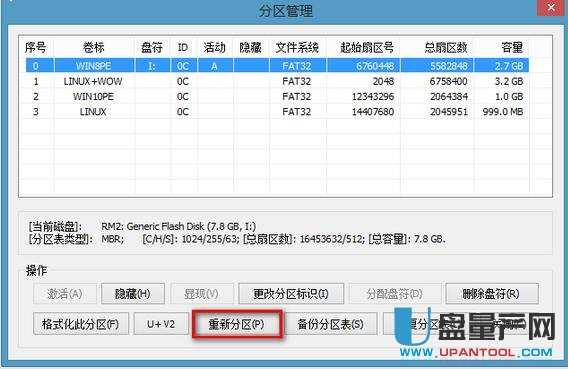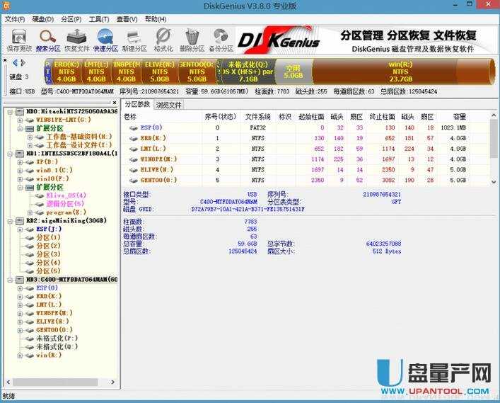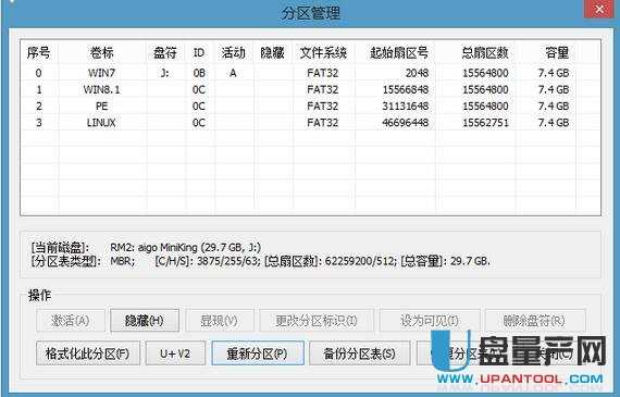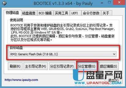 启动后注意目标磁盘为U盘大小和盘符,选择分区管理。