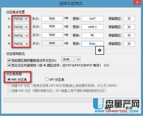 确定后进入分区格式,本处最多可分4个盘(GPT分区多一个ESP分区共5个),格式一般选择fat32格式;分区结构优化自行考虑;分区表类型选择MBR分区表(同时也支持EFI启动)。