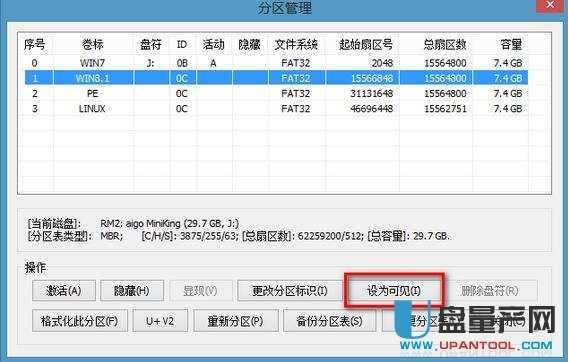 选择不同分区,点击“设为可见”,windows下就可以看到此盘。