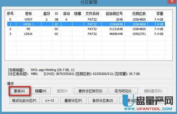 对于非PE类系统或不支持EFI的PE,需在分区管理内点击激活后作为U盘默认启动(mbr)。