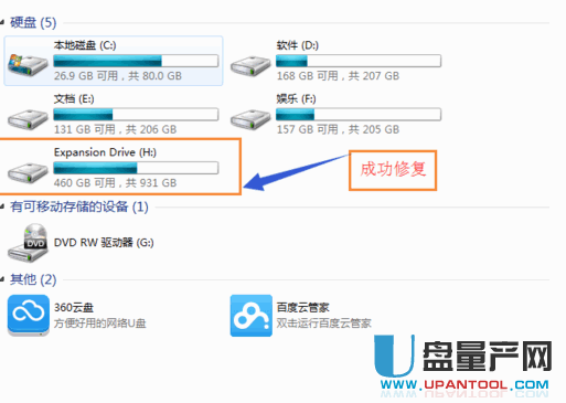 修复好以后,再去我的电脑看移动硬盘盘符就有容量条了,打开看看你的资料还在不在吧。