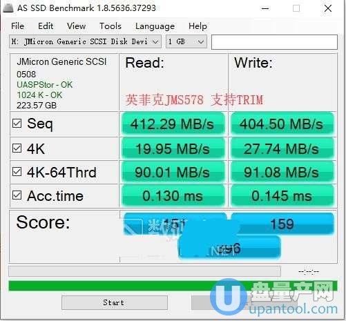 作为参照,下面的在英菲克JMS578主控的盒子下测试一下移动硬盘的速度,可以看到写入有404M/S,读取有412M/S。