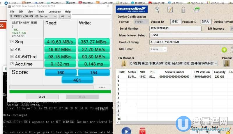 其它几个固件,性能上几乎差不多,跑分都在400上下,而在所有的固件中,支持TRIM的只有一个,140509_A1_82_40.bin,所以,如果此盒子用来装ssd,强烈建议刷这个固件。而且,本人手里一款佳翼的m.2 sata转USB的小盒子,也是这一版固件。