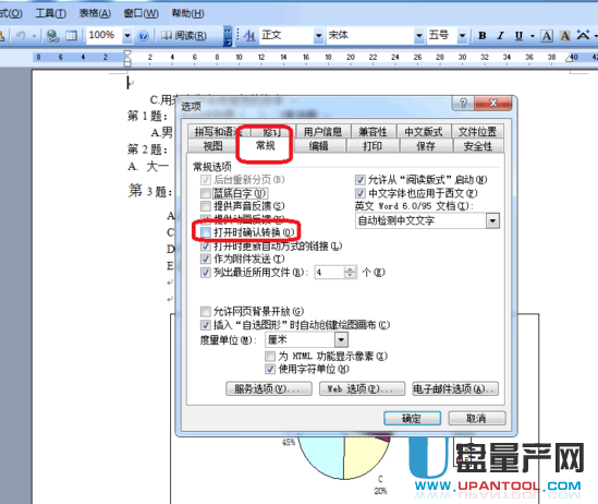 2、然后单击“工具”→“选项”→在“常规”选项卡,找到“打开时确认转换”并选中,然后点击“确定”退出