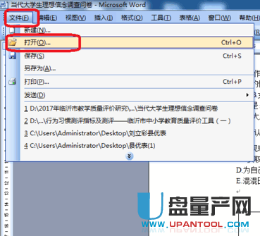 4、再点击word软件菜单栏中的【文件】→【打开】→【单击选择你需要打开的文件(请不要双击直接打开)】