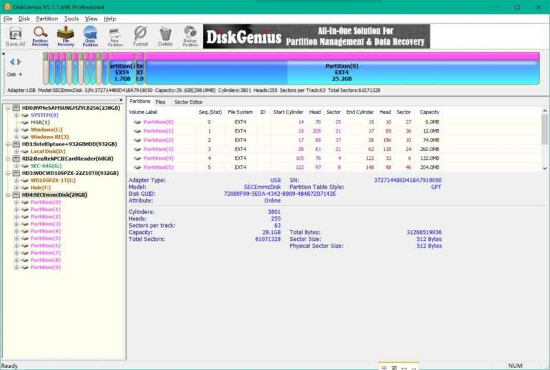 这里选用DiskGenius 4.9.5以上的专业版来恢复数据:因为它支持EXT2 3 4等Linux分区。
