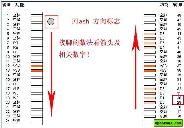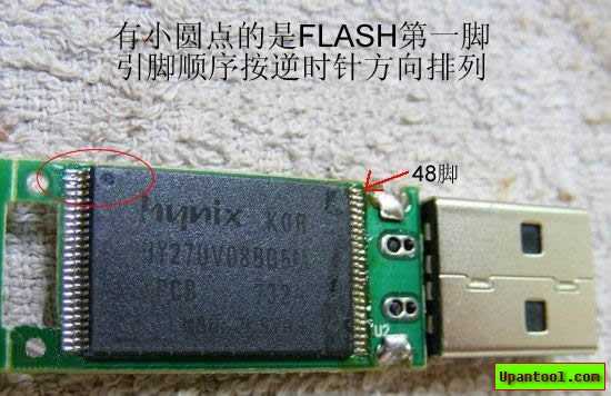 找到U盘的flash闪存,有小圆圈的是第一脚,数到最后是48脚,逆时针数