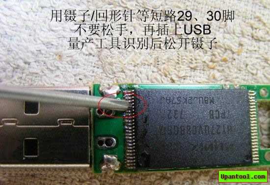 然后我们用镊子或者引线短接29和30脚,如上图,短接好以后插上电脑,让量产工具识别U盘,识别成功后,我们断开短接的镊子或者线。