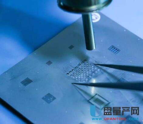 1、给闪存芯片植锡用到的植锡板,涂抹焊锡,然后热风枪加热焊锡融化成球,这样闪存芯片就能很轻易的焊接到U盘板子上。