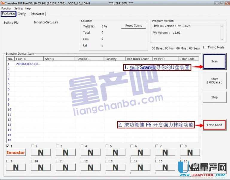2、按下键盘F6 ,可以开启强力Erase Good(抹除)功能选项。如果你的U盘先前已经量产过,或是因为某些原因造成U盘错误,可以使用 Erase Good(抹除)功能,点选它清除你的U盘,清理完成然后拔插U盘,然后再按下Scan(搜寻装置)继续接下来的量产操作;如果U盘是第一次量产,或是U 盘很正常则可以忽略这步骤。