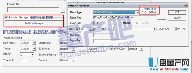 8、Partition Manager(磁区分割管理),这是用来将U盘量产为CD-ROM的功能选项(假如你的U盘已经量产过,想要恢复U盘原始模式,取消该选项后量产即可)。