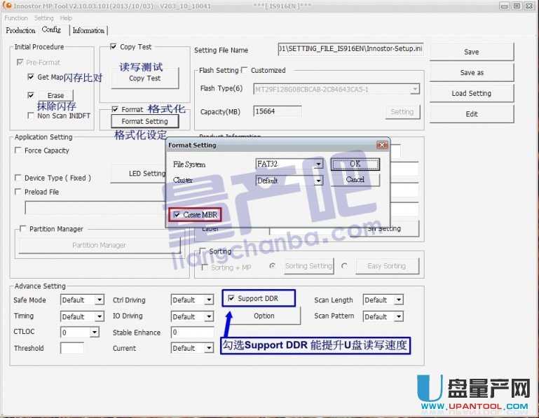 5、如下图设定勾选,其中Format Setting(格式化设定)可以设定U盘量产后可见区的格式,注意红框位置Greate MBR要勾选。