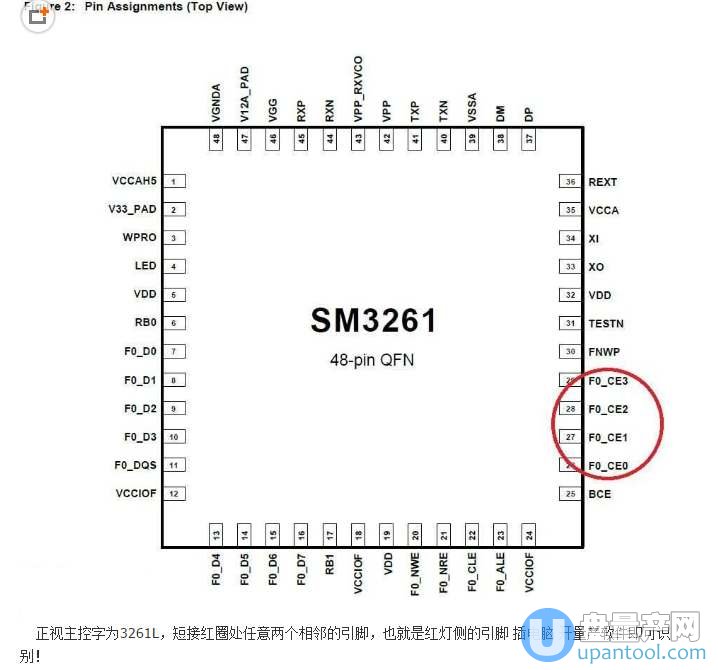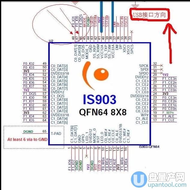 1、银灿IS903主控的U盘短接方法,可以看到短接主控的48和47两个脚。