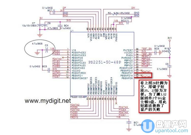 2、群联PS2251-50的短接方法如下,短接主控的25和26脚。