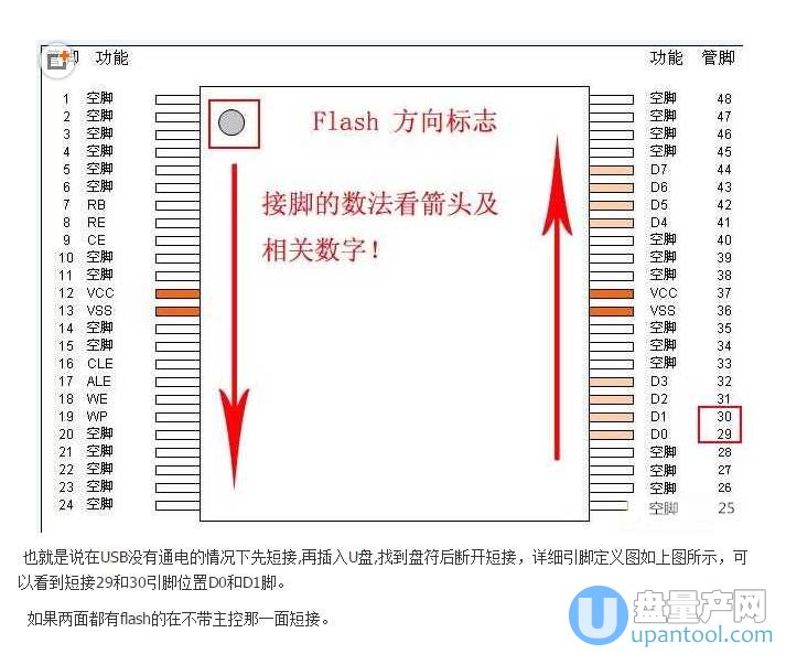 7、闪存的短接对于不同主控基本都一样,如下图位置,短接闪存的29和30引脚。