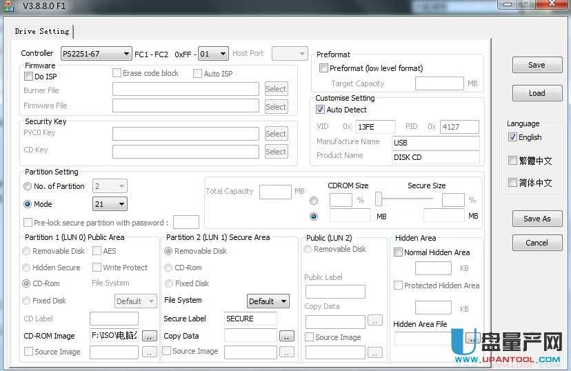 量产成功后的检测信息(实际容量为14.8Gb,包含1个1100M的UD隐藏分区和1个500M左右的CD-ROM区):