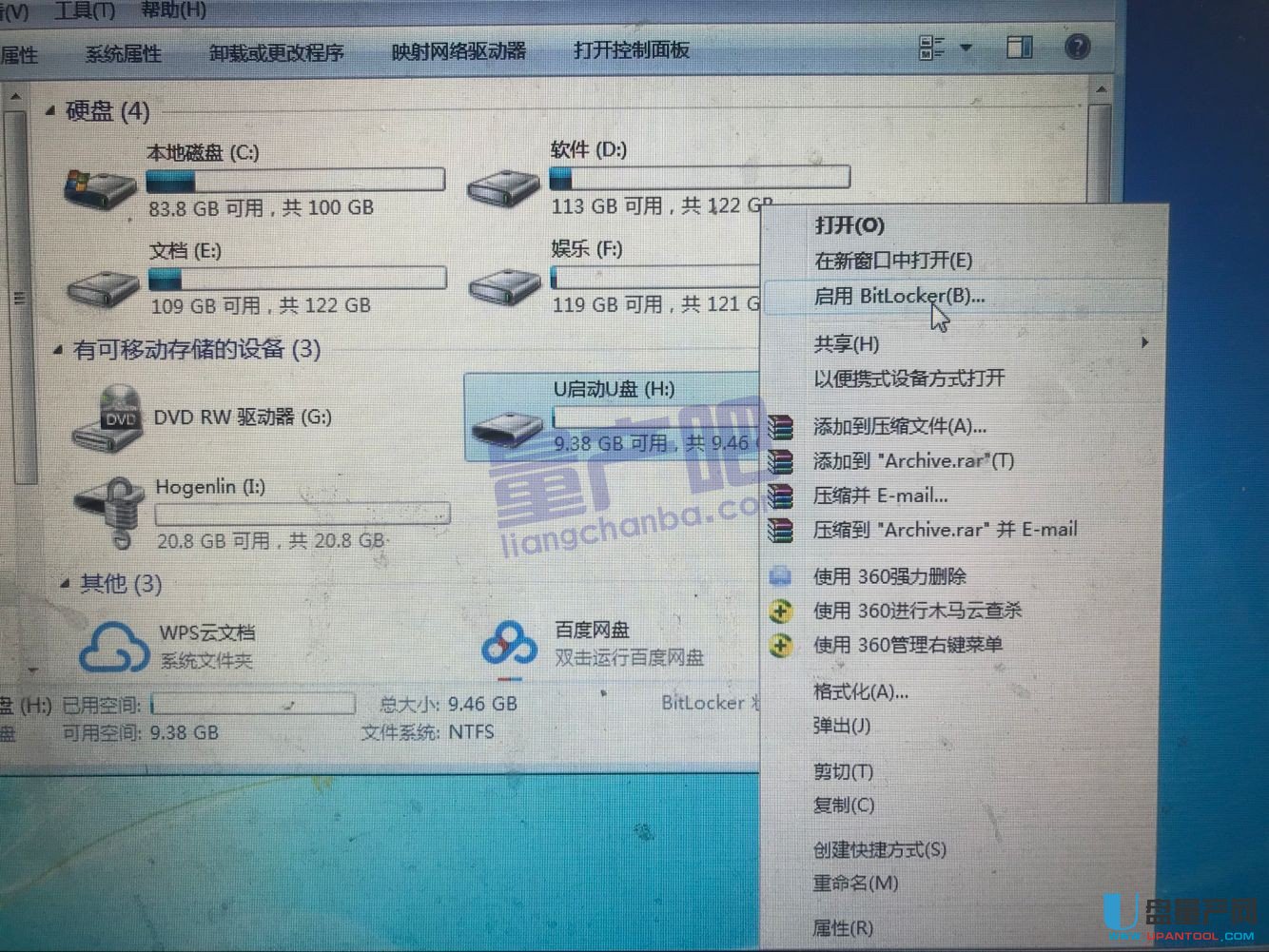 1、打开“计算机”,右击U盘图标,从弹出的右键菜单中选择“启用BitLocker”项。