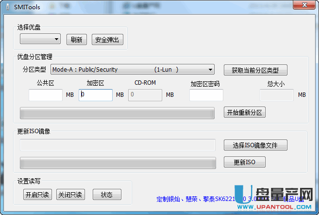 1、首先下载免量产换iso工具SMItools,然后打开它,如下图,插入U盘,点击刷新,会自动检测到慧荣主控的U盘,点获取当前分区类型,如果是首次使用,直接在分区类型里选择cdrom+public only,如果之前分过区就会自动获取之前的分区,cd-rom区大小设置为比你准备的iso镜像大即可,这里设置的780MB,剩下就公共区,然后点击开始重新分区,就把U盘分成2个区了。