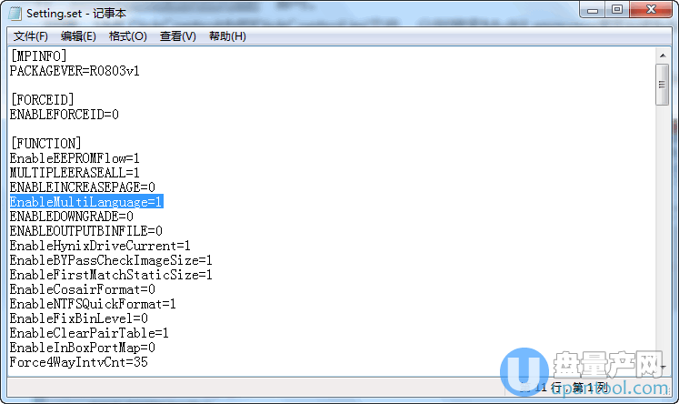 4、找到“[FUNCTION]”下,手动添加一行“EnableMultiLanguage=1”保存后,再次打开量产工具就是中文版的了。
