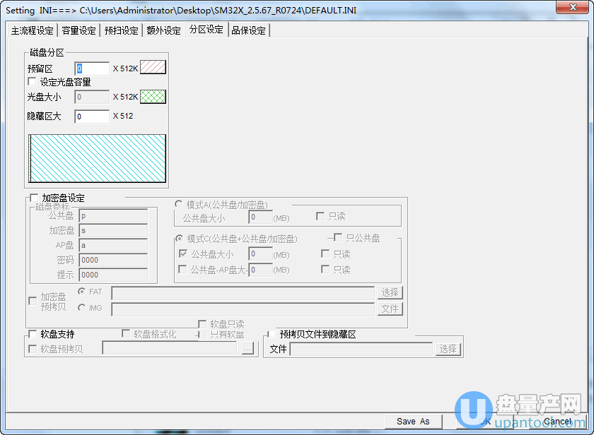 相对来说,这个老的分区设置界面只能设置一个光驱cdrom区,一个软盘区,一个加密分区,一般只能分3个区,而如果你打开了新的分区设置界面的话,你可以量产3个以上的分区,而且你可以量产两个cdrom光盘区,两个软件区,或者一个光盘一个软盘区,这是老的分区设置无法实现的,如果你有这种多个分区的需求的怎么打开新的设置界面呢?方法如下: