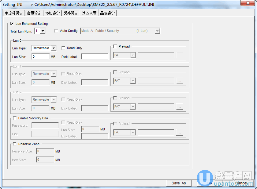 可以看到分区设置以lun为基准,有几个lun就可以分几个区,分区以lun0 ,lun1,lun2这样表示,每个分区都可以设置只读,可以设置是光盘还是软盘分区,可以设置是加密分区等等。