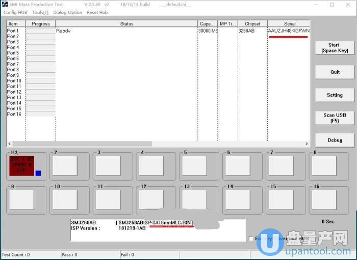 然后下载SM3268AB量产工具V2.5.69 v2,打开工具插入U盘,按一下“Scan USB"按键,如下图已经识别到U盘了,ready字样。