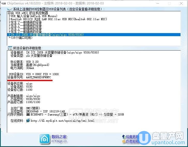 一个正品的爱国者U330,32GB USB3.0 U盘坏了,只能用量产的方法来修复,首先是用ChipGenius软件测主控,看看是不是有对应的量产工具,结果如下