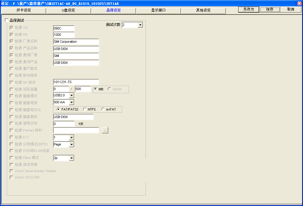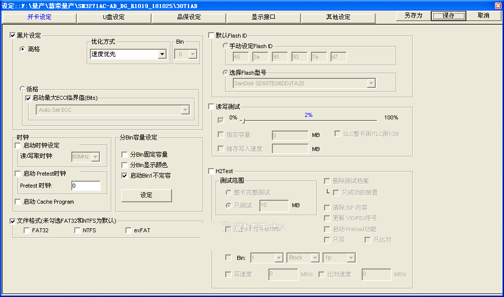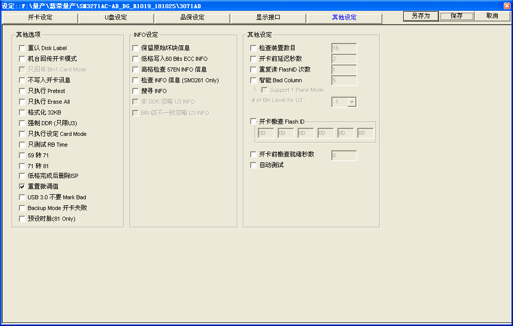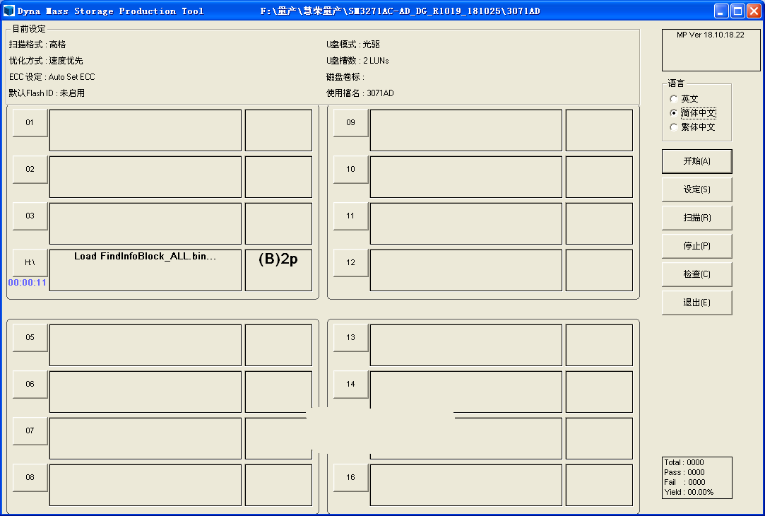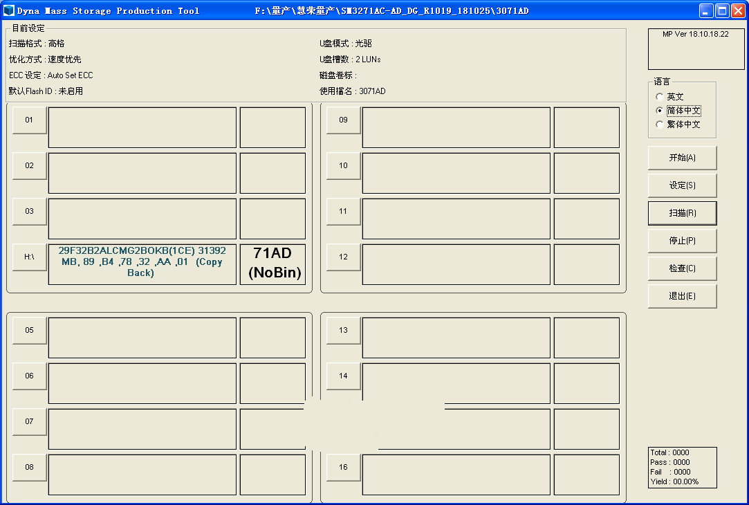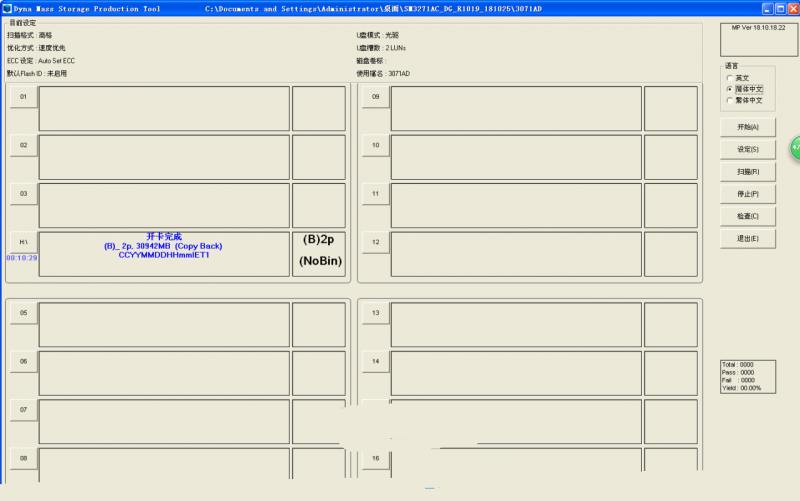 1、然后下载SM3271AD的量产工具,目前此主控的工具不多,这是其中一个,最好在xp系统下使用,然后插好U盘,打开量产工具如下图,点击设定,密码两个空格,然后首先设置开卡设定项目如下图这样填写,勾选黑片设定,选择高格,速度优先,然后启动最大的ECC临界勾选。