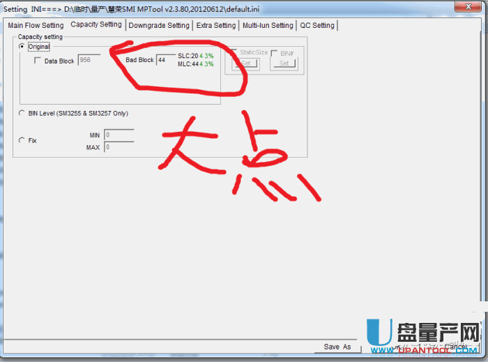 其实这个提示的意思就是你的U盘坏块太多了,不能按正常步骤量产,要改改设置。