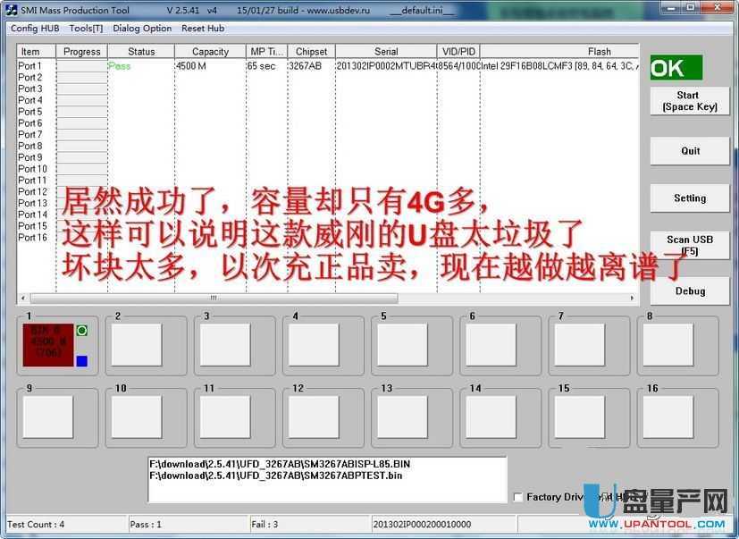 重新量产,指示灯快速闪烁,10多分钟就完成了 量产任务。量产前容量7650M,坏块数量226填写后,有效容量变成6337M了。