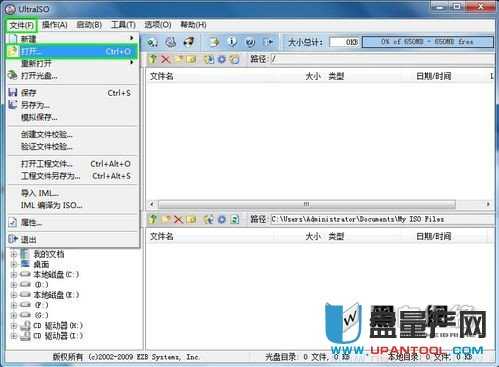 然后打开UltraISO的窗口后依次点击左上角的“文件”-“打开”,选择你的ISO路径,选定打开;