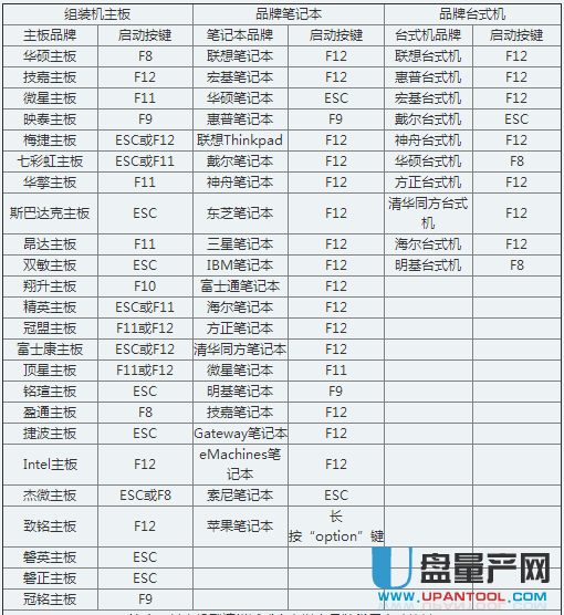 下面小编列出各种品牌的一键启动u盘的快捷键查询表: