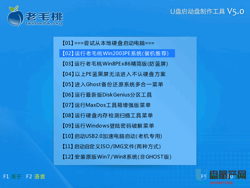 当进入到老毛桃启动u盘主界面的时候,我们按上下方向键将光标选择到“【02】 运行老毛桃Win2003PE增强版(装机推荐)”后,按下回车键进入;