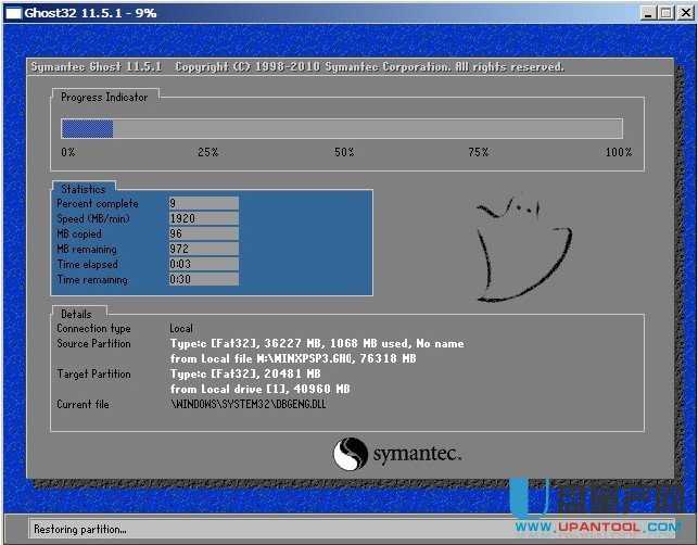 接下来会出现一个正在解压GHO的窗口,该窗口有进度条,此时我们无需做任何操作,只需耐心等待其完成即可