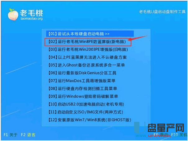 首先准备一个U盘,然后制作好U盘启动盘。(制作方法跟方法一里面介绍的一样)U盘启动盘制作好后从网上下载win7、win8的iso系统镜像文件并保存到U盘中,将制作好的老毛桃U盘插入电脑USB接口中,启动电脑,按相应的电脑启动快捷键进入老毛桃主菜单,用键盘上的方向键“↓”切换到【02】运行老毛桃Win8PE防蓝屏版(新电脑)