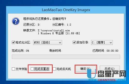 运行“老毛桃PE一键装机”工具后,该软件会自动识别ISO镜像文件(即刚才我们下载复制到U盘GHO文件夹里面的那个ISO镜像包),并自动提取里面的GHO文件。我们只需点击“确定(Y)”按钮即可!