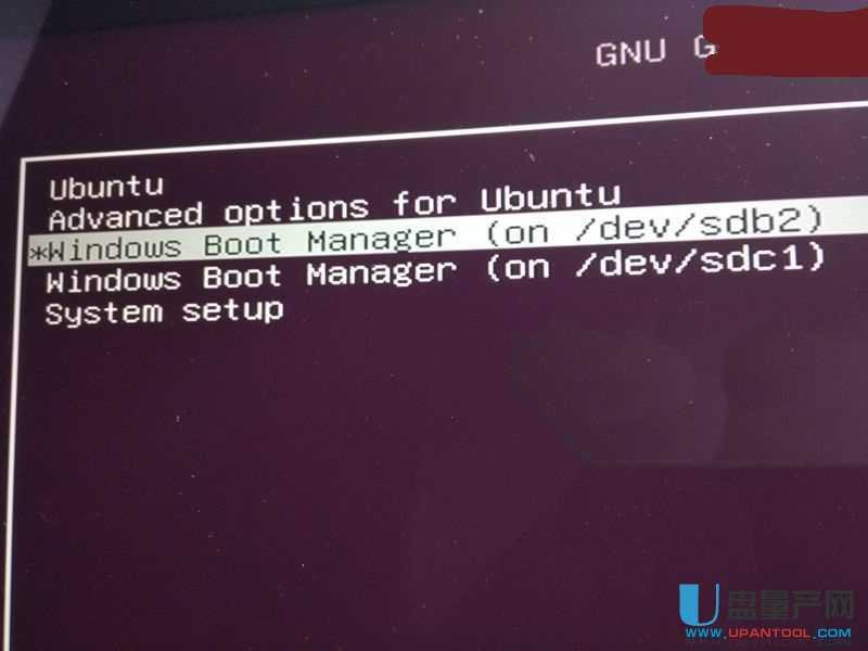 Ubuntu的启动菜单。可以启动Ubuntu、优盘内的Windows、本机的Windows。