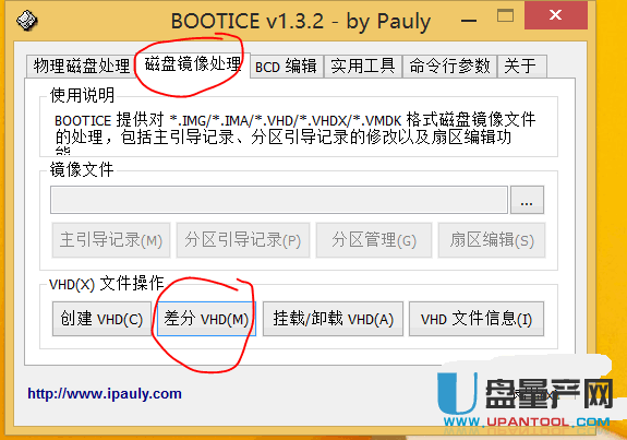 2.打开BOOTICE,在磁盘镜像处理标签下 ,点击差分VHD按钮
