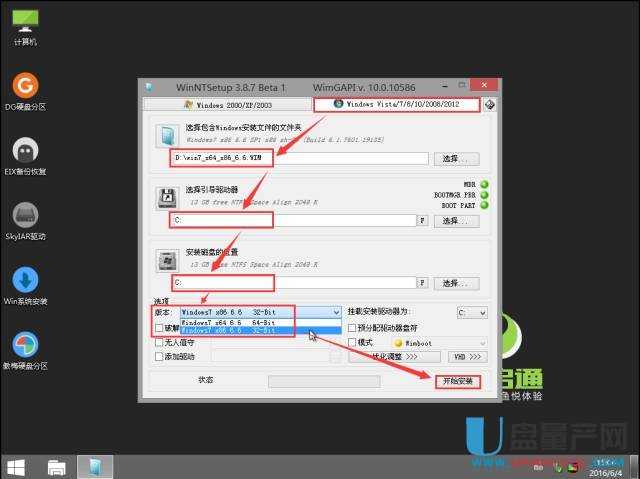 6、按下图顺序选择你下载准备好的WIM格式镜像、安装位置与想安装的版本(x86或x64)