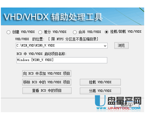 3.下载VHDX_OneKey,向当前系统BCD中添加VHD启动项(目前这个就是VHDOS,可以随意修改、保存),如图,然后重启,就会进入WIN7精简版安装进程,装好驱动,再没什么要改的话,就进msconfig中把这个启动项删除(也可以留着以后方便修改)。