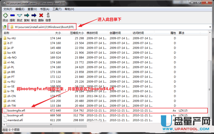 使用7z或者好压解开这个文件,将文件中的 1WindowsBootEFI 这个目录下的bootmgfw.efi,将其复制到你的电脑上, 并重命名为bootx64.efi,如图所示:
