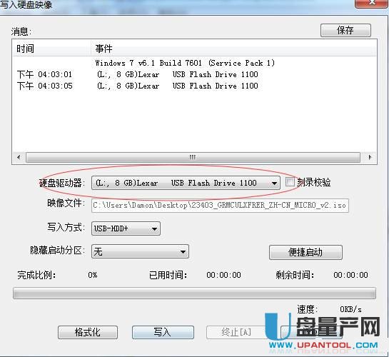 4、然后在硬盘驱动器位置你要选择你的U盘,这里选择的是L盘8G的,大家别选错到你的硬盘了,映像文件选择你的win7的iso文件,写入选usb-hdd+,然后点写入。