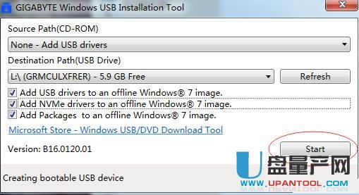 5、本来上面的步骤写入成功后,我们就可以用U盘启动电脑来装win7了,但这里我们要先注入ssd的驱动,顺便把usb3.0的驱动也注入了;步骤是,打开技嘉驱动注入工具,cdrom位置选none,usb位置选你的U盘,把下面三个勾都打上如下图,然后点击start按钮。